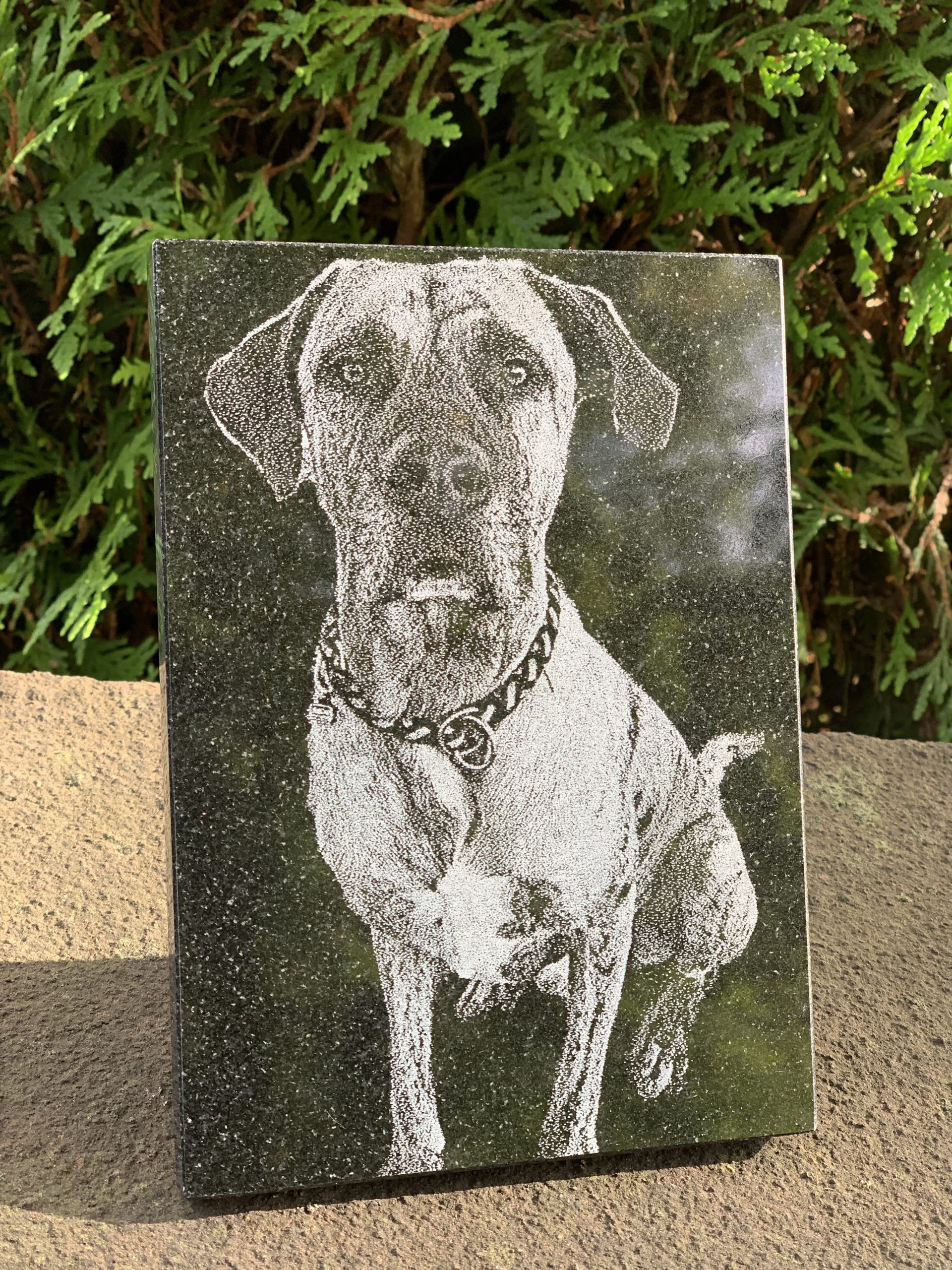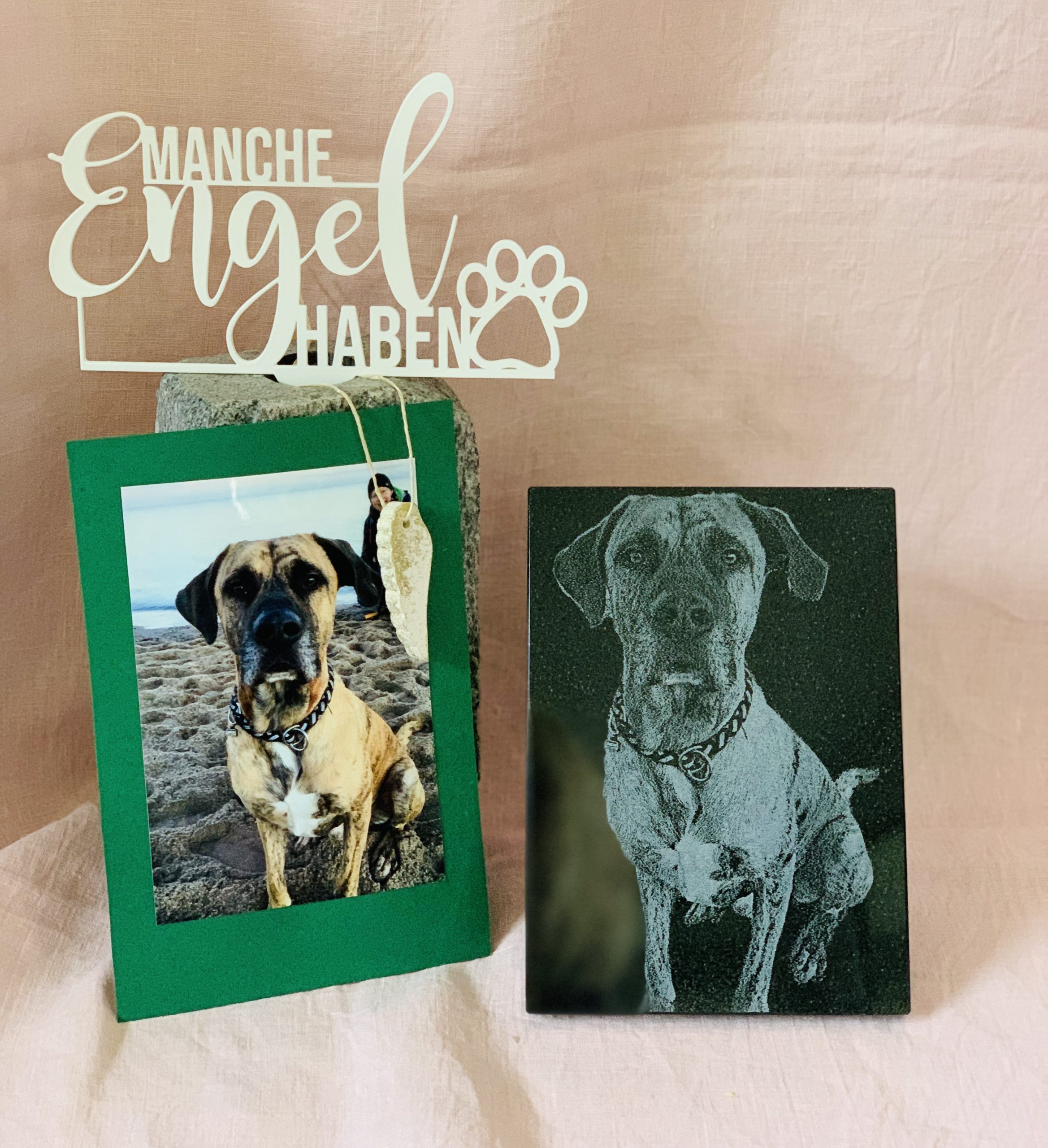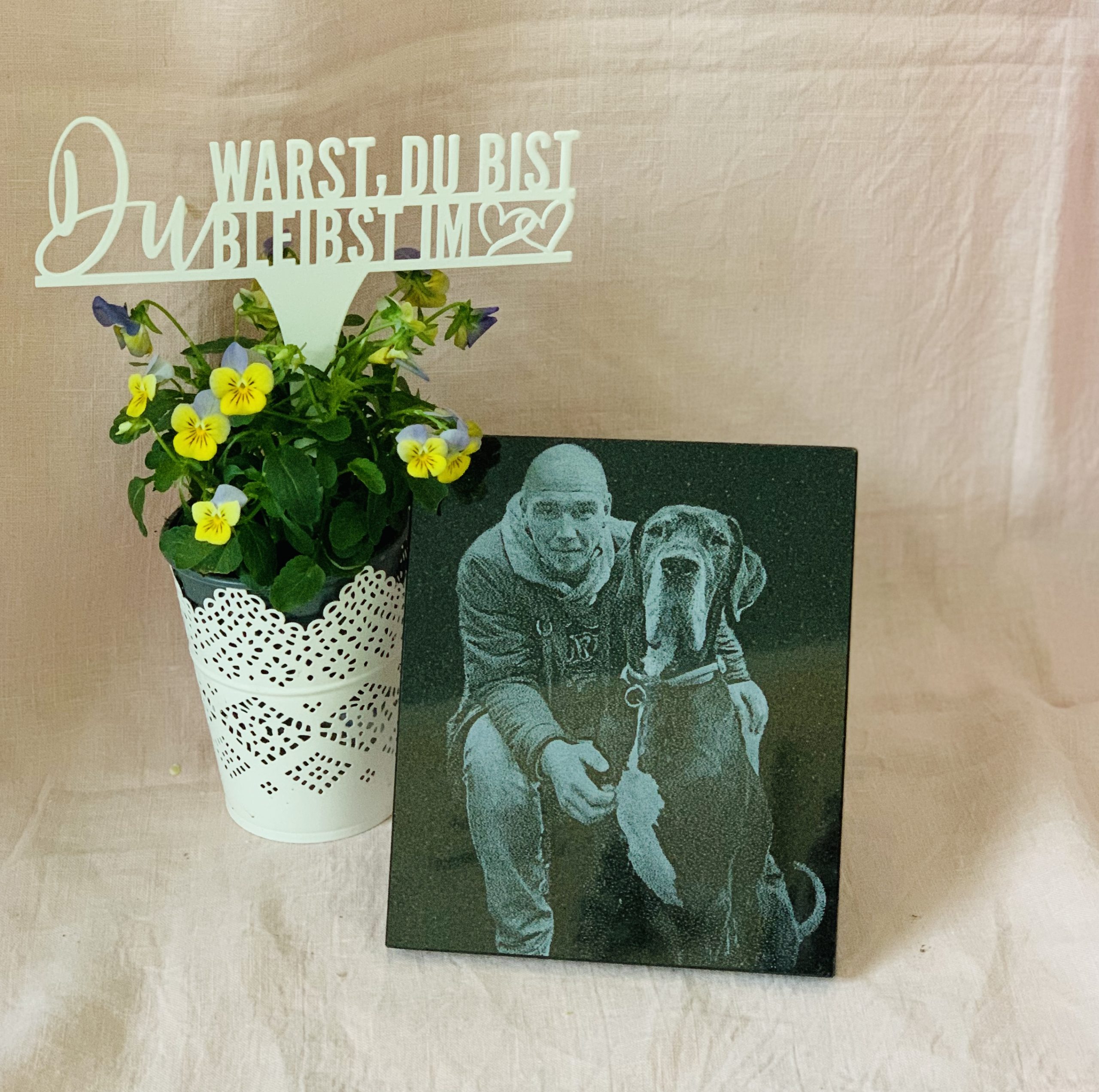 Dazu benötigen wir ein schönes Portraitfoto und Ihre Wünsche zur weiteren Gestaltung des Gedenksteins. Welche Größe, welche Form stellen Sie sich vor? Soll vielleicht der Name ebenfalls eingraviert werden? Symbole oder Ornamente sind ebenfalls möglich.